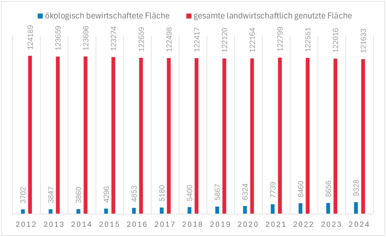 Entwicklung der ökologisch bewirtschafteten Fläche in Bezug zur gesamten landwirtschaftlichen Nutzfläche des Landes (in Hektar)