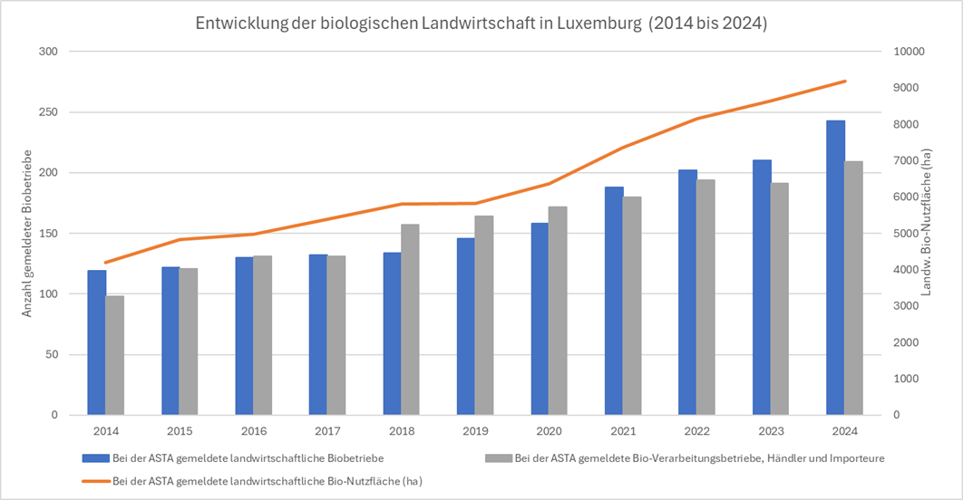 Wie aus der Grafik hervorgeht, hat sich die Anzahl der Biobetriebe in den letzten zehn Jahren verdoppelt. Mittlerweile wirtschaften 243 Betriebe biologisch, wobei 50 davon nur einen Teil oder Bereich ihres Betriebes auf biologische Landwirtschaft umgestellt haben. Die Biobetriebe lassen sich gemäß ihrer Hauptaktivität in verschiedene Kategorien einteilen: 117 Landwirte, 19 Gemüsegärtner, 23 Winzer, 28 Obstbauern, 28 Imker, 26 reine Zuchtbetriebe sowie andere kleine Aktivitäten und 2 Betriebe mit Spezialkulturen. Auch die biologisch bewirtschaftete Fläche hat sich von 4.200 Hektar im Jahr 2014 auf 9.200 Hektar im Jahr 2024 mehr als verdoppelt. Mittlerweile werden knapp 8,8 % der gesamten landwirtschaftlich genutzten Flächen biologisch bewirtschaftet.